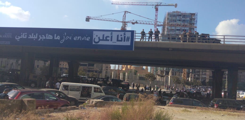 تشهد الطرقات المؤدية الى وسط بيروت حيث التجمع الشعبي، عجقة سير خانقة. alt="تدفق المحتجين الى ساحة الشهداء"